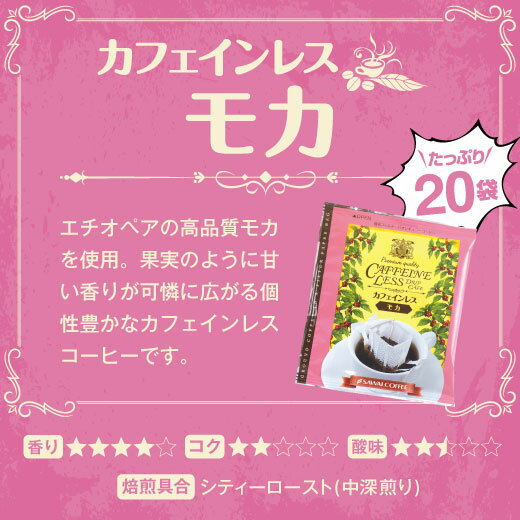 生豆生産国 コロンビア→コロンビア マンデリン→インドネシア ブラジル→ブラジル モカ→エチオピア お届け方法 通常発送 内容量 ●ドリップバッグ ・マンデリン 8g×20袋 ・コロンビア 8g×20袋 ・ブラジル 8g×20袋 ・モカ 8g×20袋 賞味期限 製造日より一年 商品説明文 美味しいカフェインレスと言ったら澤井珈琲。